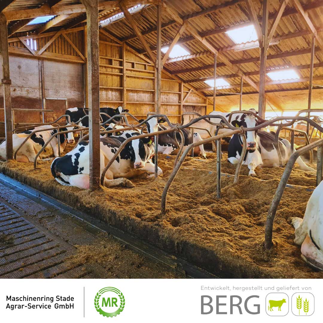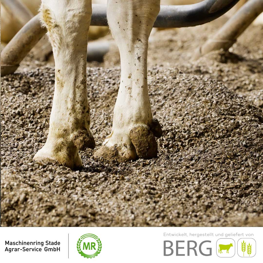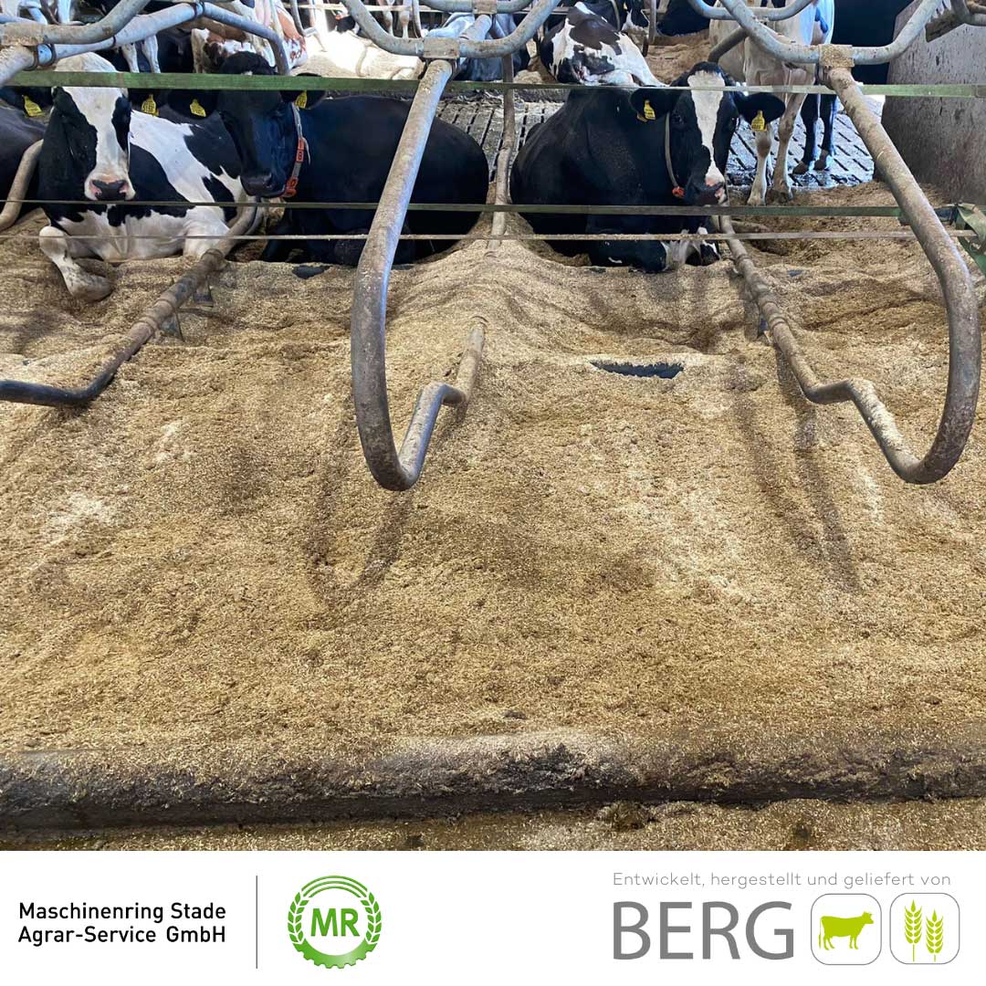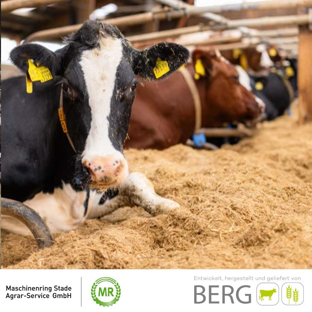 Seit Juni 2025 bieten wir als erster Vertriebspartner in Deutschland die Produkte der Firma Berg Agrar an. Wir verkaufen maßgeschneiderte Einstreu-Mischungen für Liegeboxen. Mit über 80 verschiedenen Rezepturen können wir betriebsindividuell auf alle Boxentypen und Hygieneprobleme eingehen. Die Hauptbestandteile der Mischungen sind Stroh oder Flachs und Kalk.