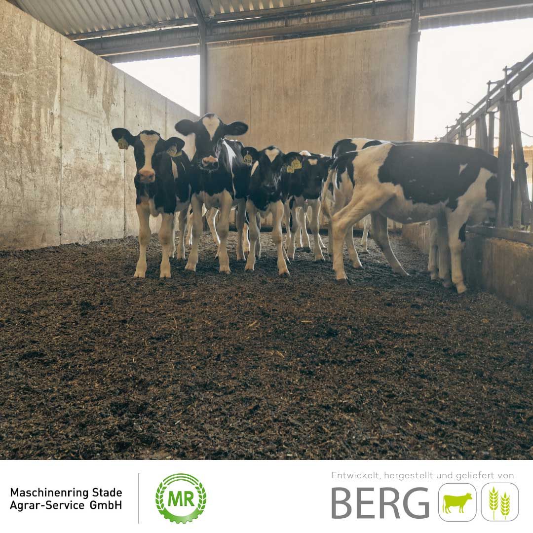 Seit Juni 2025 bieten wir als erster Vertriebspartner in Deutschland die Produkte der Firma Berg Agrar an. Wir verkaufen maßgeschneiderte Einstreu-Mischungen für Liegeboxen. Mit über 80 verschiedenen Rezepturen können wir betriebsindividuell auf alle Boxentypen und Hygieneprobleme eingehen. Die Hauptbestandteile der Mischungen sind Stroh oder Flachs und Kalk.
